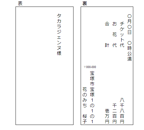 表面には『ジェンヌさんのお名前』、そして裏面には『公演日時』、『チケット代』、『お花代(サポート代)』、『合計金額』、そして『お名前』を書き入れます。