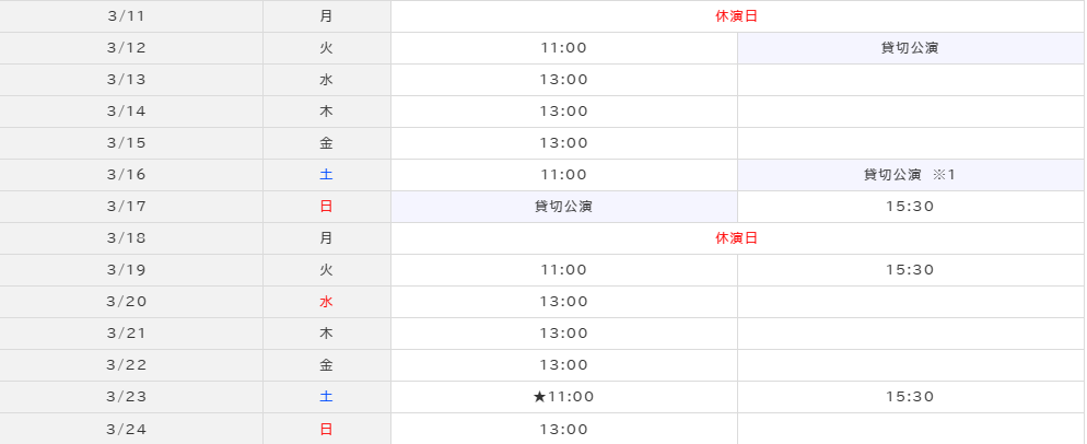 また千秋楽前の日程は、通常火曜日と水曜日が2回公演、木曜日が1回、金曜日が2回が通常のようなのですが、祝日にもかかわらず3月20日(祝水)からまたしても3日連続1回公演です。